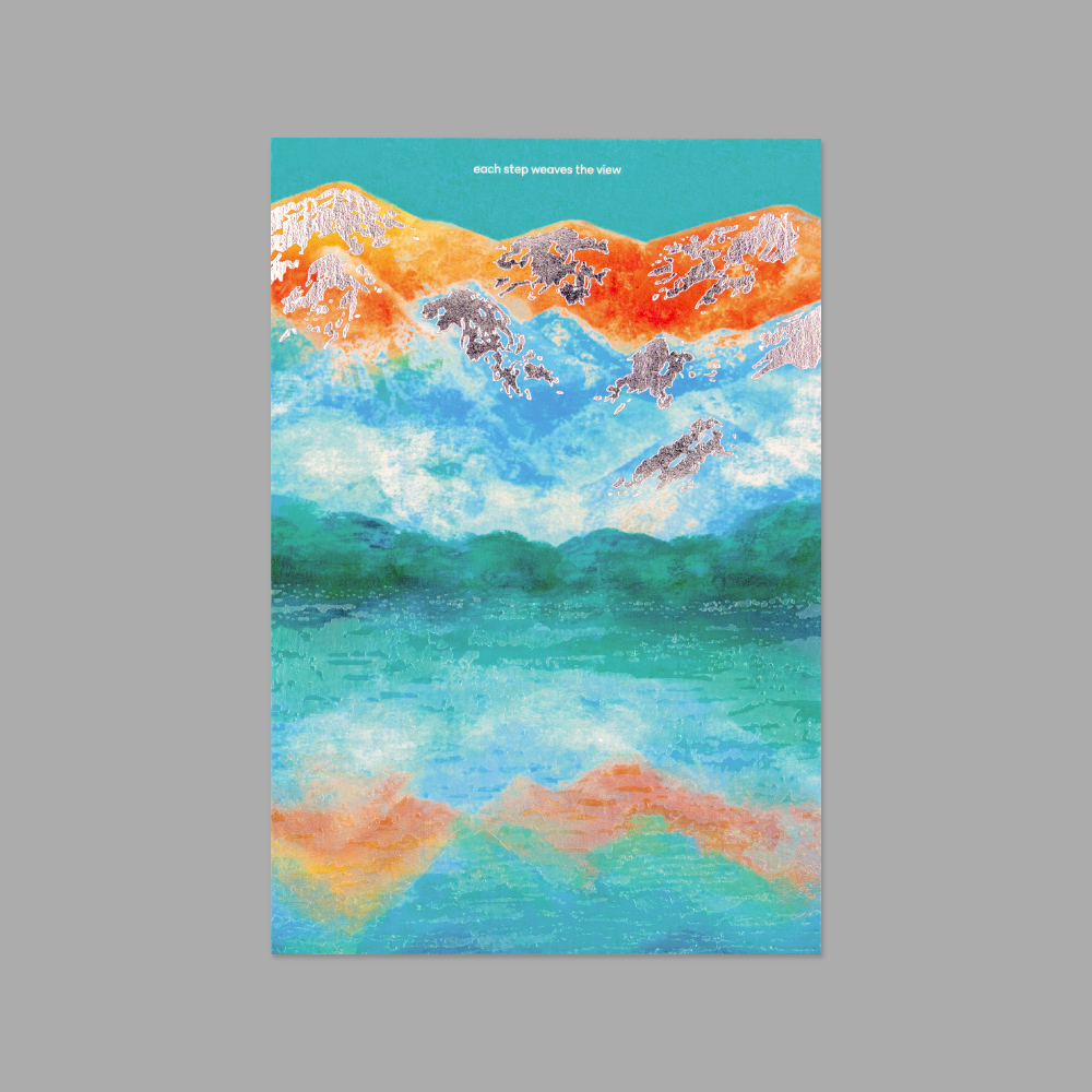 3種を並べて山が連なる、湖を描いたポストカードです。