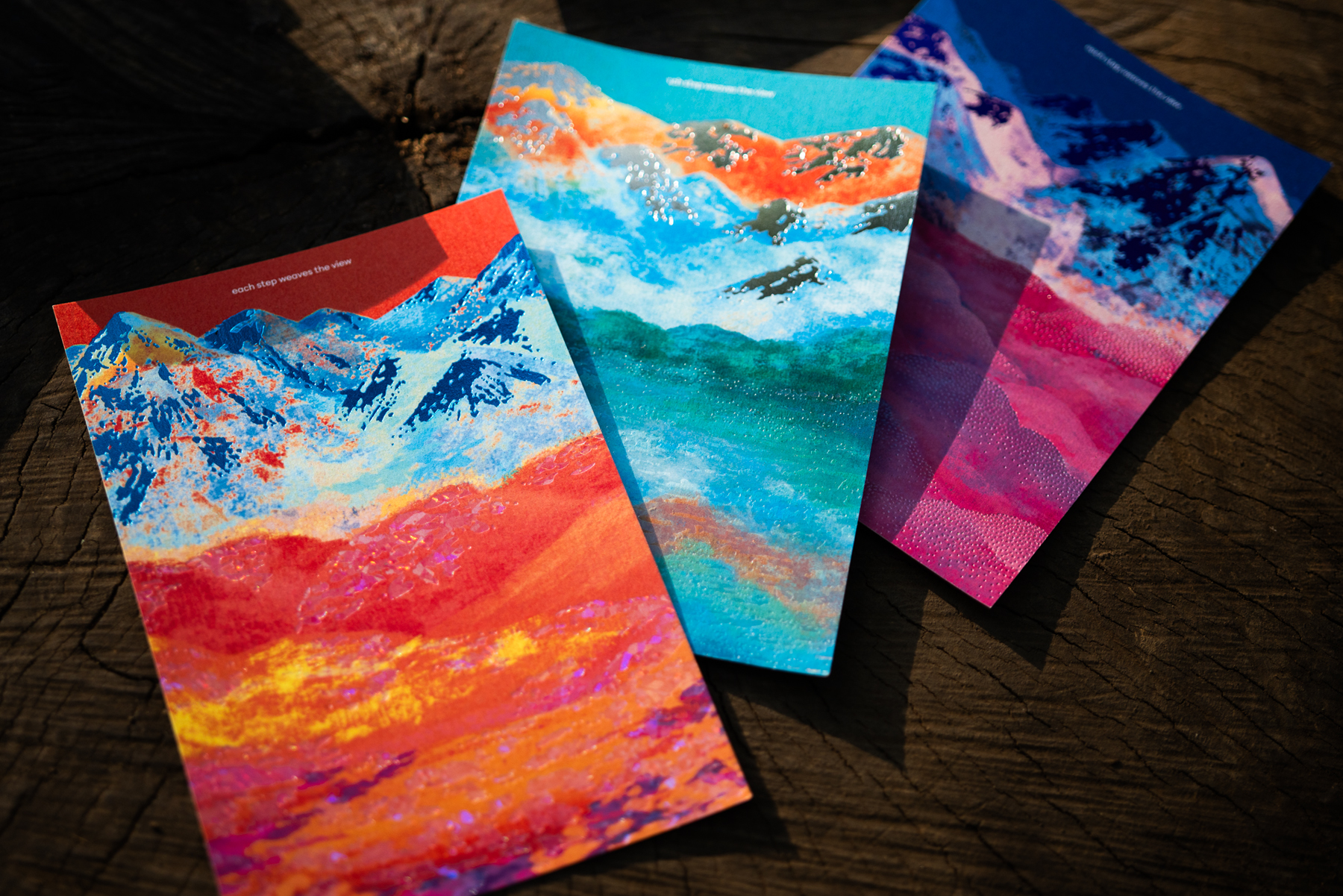 連なる山々を3つの異なる景色で描いています。山の立体感をメタリック箔で、大地や水面、雲海の質感をクリア箔で表現しました。(3種類・各税込330円)
