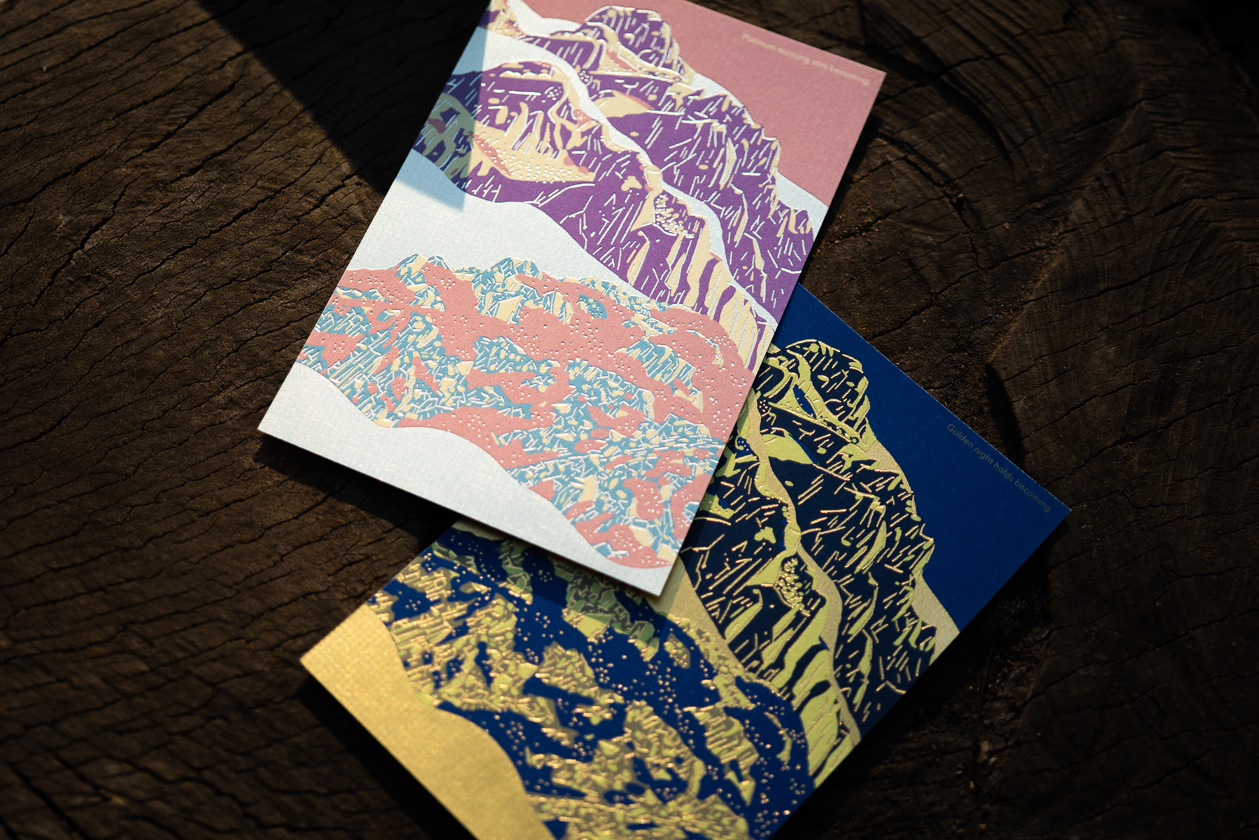 高嶺の朝と夜、それぞれの時間の美しさを箔と色使いで表現しました。同じ景色でも異なる印象を楽しめます。砂目のようなテクスチャも魅力です。(2種類・各税込330円)