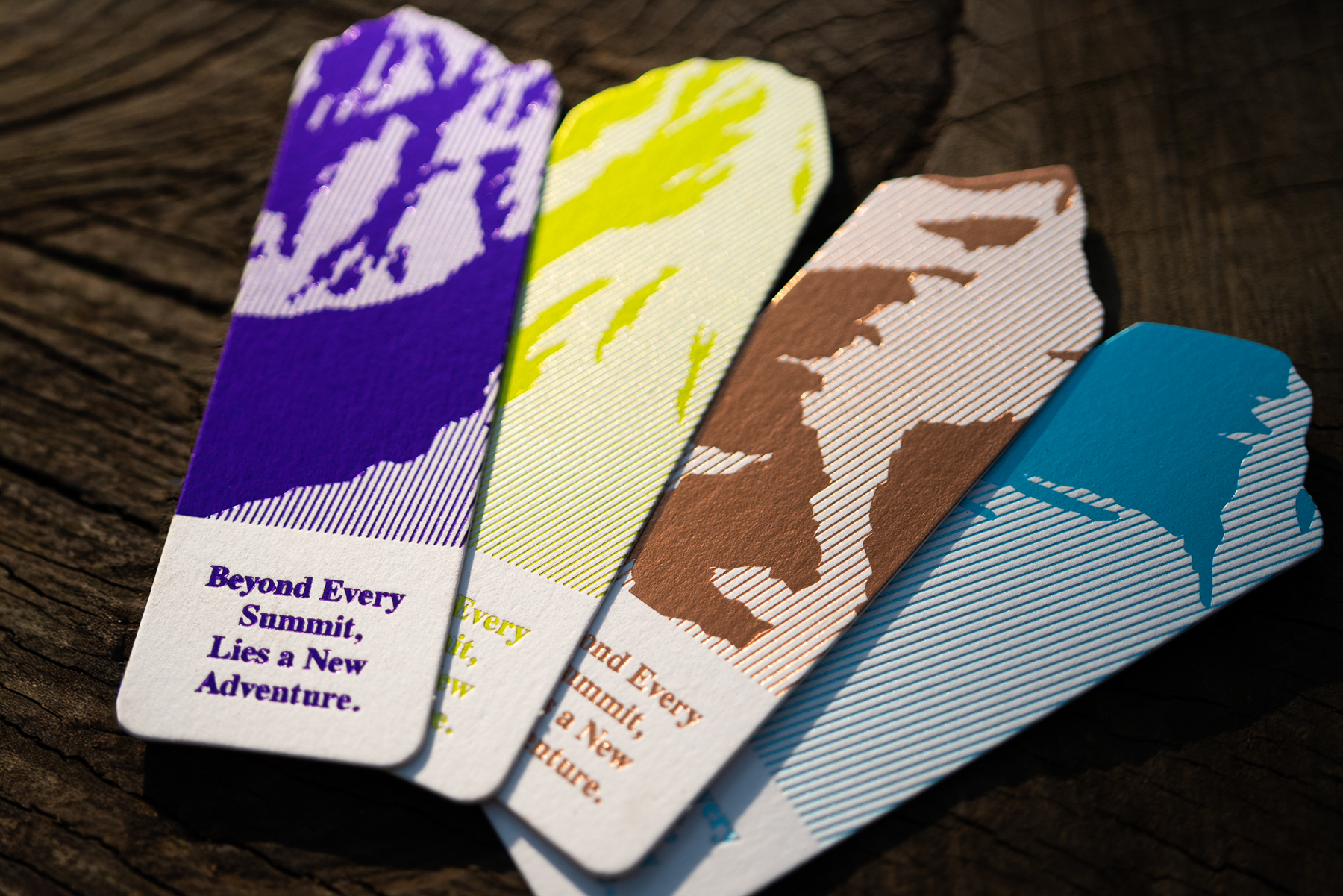 上部が山の形にダイカットされており、本に挟むと山の姿が現れます。四季折々の山のイメージを箔押し加工のみで表現した、職人技が光るアイテムです。(4種類・各税込440円)
