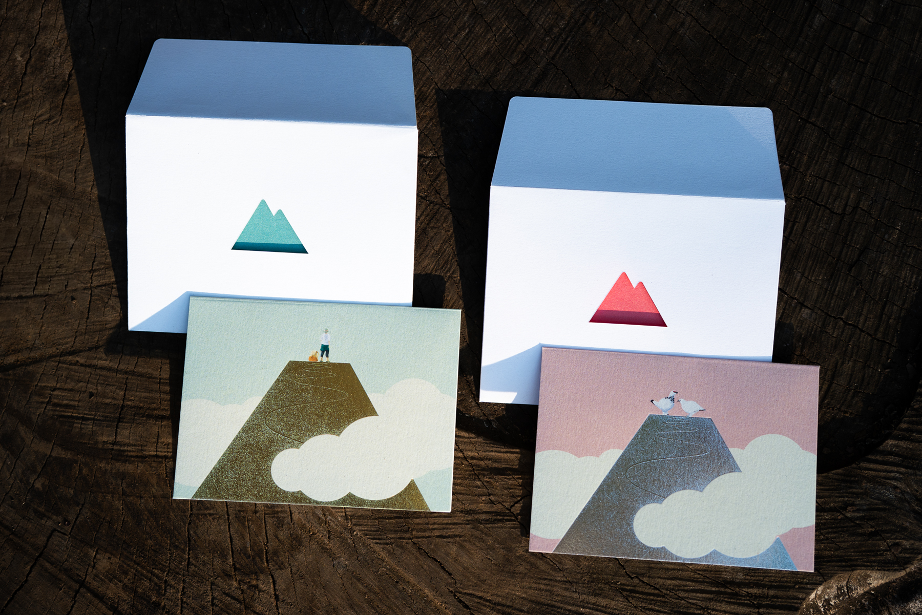 封筒に施された山型の切り抜きから、箔押しがきらりと覗きます。カードには、大切な記念日にふさわしい“山の頂”をデザイン。角度で表情が変わる加工にもこだわりました。(2種類・各税込550円)